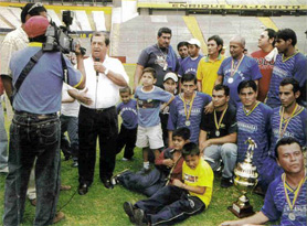 Luciendo el precioso trofeo y el cheque de mil dólares, el Ing. Aguirre posa con el goleador del torneo.